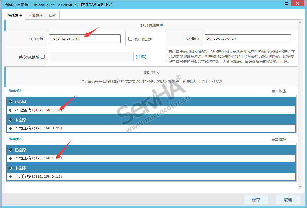 将两台服务器连入服务网络的网卡分别配上固定(静态)IP,此IP又称为“实际IP”,可按需配置双网卡绑定来提高网络链路的可用性。