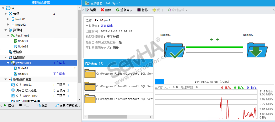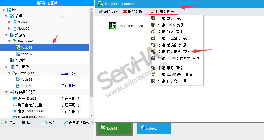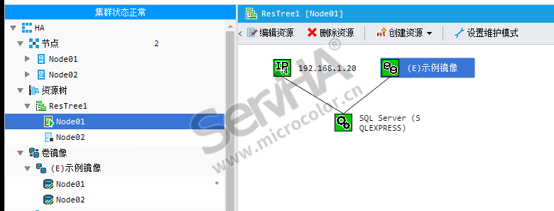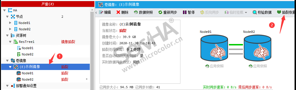 为了方便用户确定镜像脑裂后的数据保留方,在镜像脑裂的状态下资源树也可以进行切换,但是数据不会同步到对机,您可以通过资源切换/建立快照,备份或者验证数据有效的一方,最后选择脑裂恢复方向,避免关键数据的丢失。