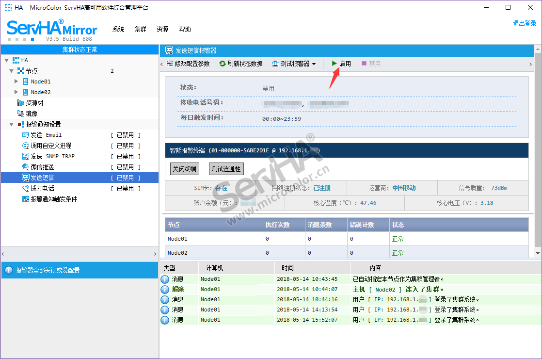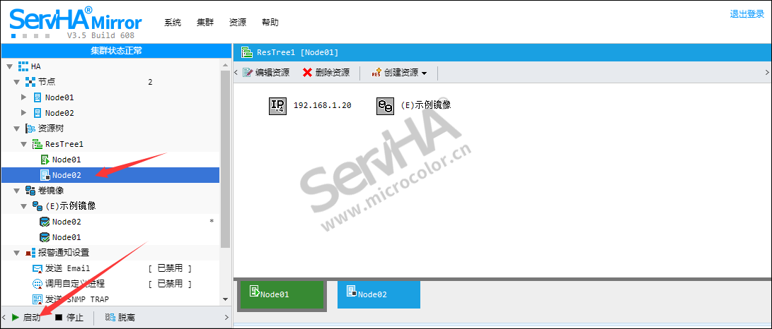 在热备界面左侧资源树下,单击要切换到的节点(蓝色的节点为当前的备机),点击启动按钮。