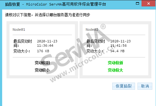 比对两台机器的差异数据,选择合适的一端,点击“恢复脑裂”: